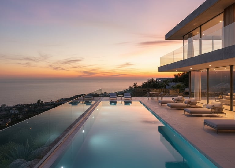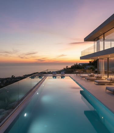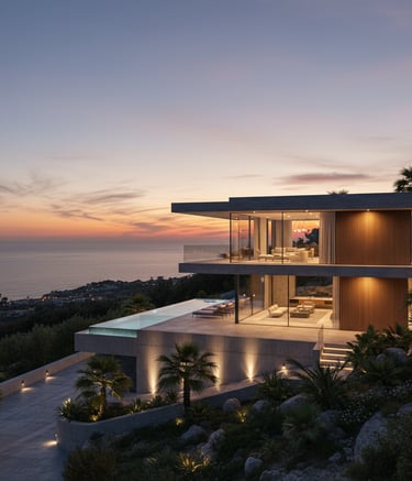 Una villa contemporánea de dos plantas situada en una ladera soleada con vistas a un mar turquesa. El diseño es minimalista y geométrico, con un...