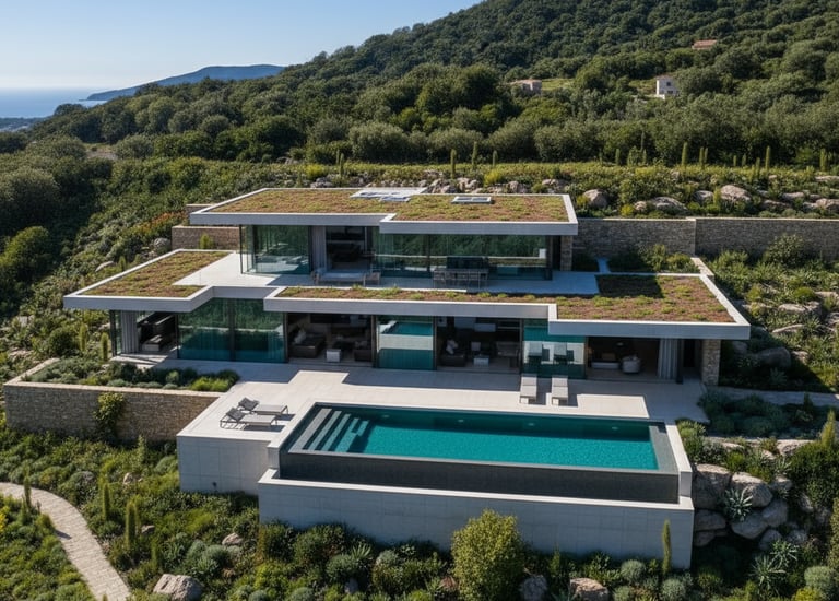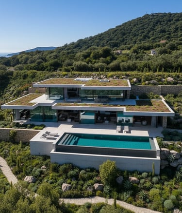 Una villa contemporánea de dos plantas integrada en una verde ladera que desciende hacia el mar. La casa presenta un diseño en cascada con tejados planos verdes y...